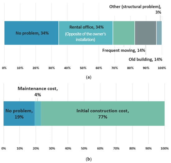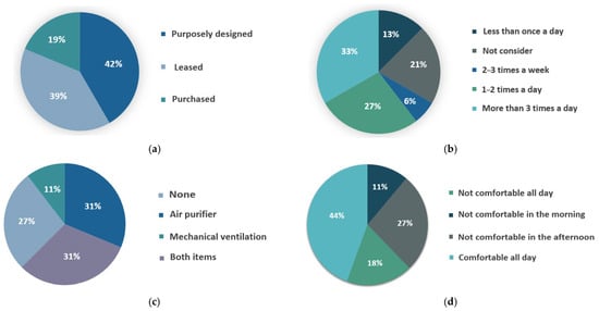 According to Figure 4a, which contains the responses to the questions items shown in Table 1, only 42% of buildings were designed for office work, and according to Figure 4b, the proportion of buildings reporting ventilation three times or more per day through windows was low, at approximately 33%. Figure 4c shows that the ERV, which is a mechanical ventilation system, was not installed in 69% of the buildings. Furthermore, Figure 4d indicates that 56% of the respondents felt uncomfortable with the indoor air quality of their office space.