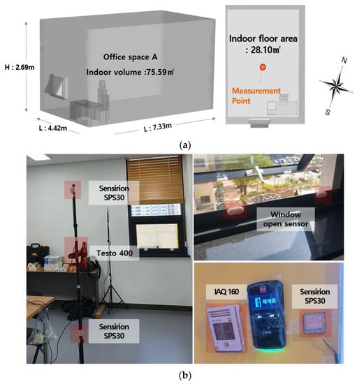 Measurements were obtained with one or two occupants, reflecting the usage characteristics of this space. The measurement of fine dust was performed using a Sensirion SPS30 (acquiring the monitoring certification by the U.K. Environment Agency), and the measurements of temperature and CO2 concentration were performed using a Testo 400 and IAQ160. Measurements were obtained at three locations: outdoor, indoor, and hallway. Figure 5a shows that the indoor measurement points were located at the center of the building.