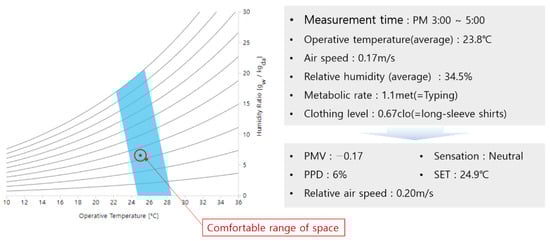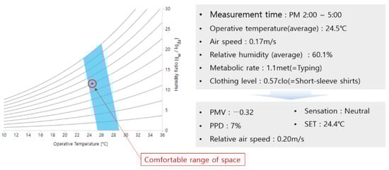 Moreover, to analyze the comfort and indoor air quality of the first office space analysis, the predicted mean vote (PMV) of the office space was determined, and the concentrations of CO2 and fine dust, which are representative indoor air pollutants, were measured [,,,].