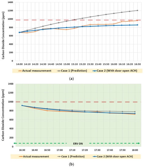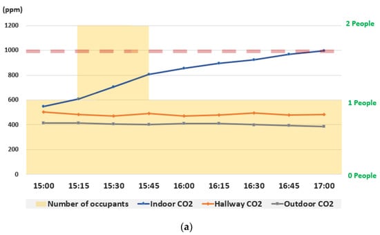 As shown in Figure 7a, as a result of one occupant staying in the office space for 15 min, it was found that the CO2 concentration increased by about 40–50 ppm (about 3 ppm/min) per 15 min. During the two-person meeting for 30 min from 15:15 to 15:45, the CO2 concentration increased by 200 ppm (about 6.7 ppm/min).