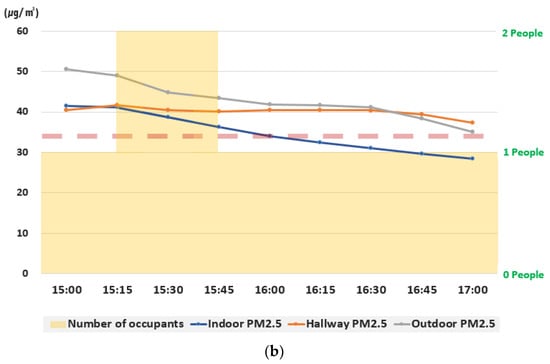 As shown in Figure 7b, the PM2.5 concentrations on 20 April was 41 μg/m3 at 15:00, when the occupant entered this space at the occupant’s breathing height of 1.2 m [], which exceeded the indoor standard of 35 μg/m3. In contrast, it decreased to 28 μg/m3 at 17:00 after 2 h, indicating that the decrease per hour was 0.108 μg/(m3 min). In addition, a comparison of PM2.5 concentration between outdoor, hallway, and office space, showed that the concentration was the lowest indoors. Despite the non-operation of natural and mechanical ventilation, the PM2.5 concentration decreased to 35 μg/m3 or less, which is the domestic indoor air quality standard, after 1 h occupancy.