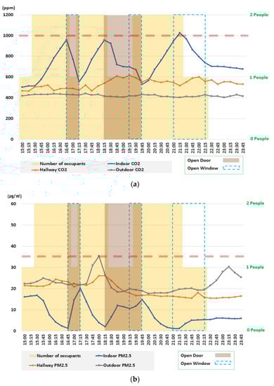 Concentration measurement of (a) CO2 and (b) PM2.5 on 20 April 2021.