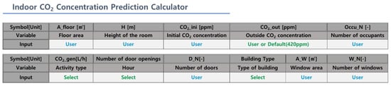 In the case of the prediction tool, 1000 ppm of CO2 was set as the reference concentration, which is the indoor air quality maintenance standard prescribed by the Indoor Air Quality Control Act. As listed in Figure 9, five input parameters (i.e., factors affecting the change in CO2 concentrations in office spaces) were selected.