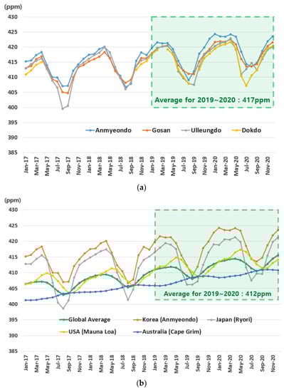 Annual average outdoor CO2 concentration: (a) domestic [] and (b) foreign countries [].