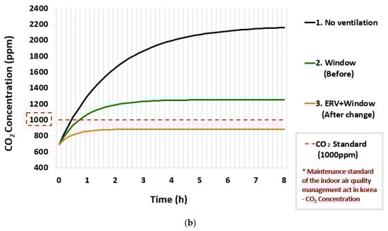 As shown in Figure 17, each element was entered into the input items, to perform the prediction. The prediction results on indoor CO2 for space B are shown in Figure 18a, and the predicted value of the indoor CO2 concentration before improvement belongs to “1. No ventilation” values. According to the graph of the prediction results, the outcome exceeded the domestic CO2 standard concentration of 1000 ppm [] after 30 min of occupancy; in the case of “2. Window (Before)”, including ventilation by opening the window, the outcome exceeded the domestic CO2 standard concentration of 1000 ppm [] after 50 min of occupancy.