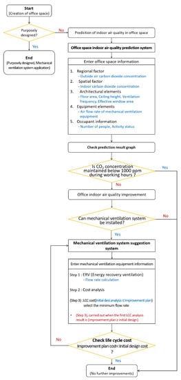 Ventilation is becoming increasingly important to improve indoor air quality and prevent the spread of COVID-19. This study analyzed the indoor air quality of office spaces, where occupants remain for extended periods, among multi-use facilities with an increasing need for ventilation system application. A “tool for office space CO2 prediction and indoor air quality improvement recommendation” was developed. The research method was divided into four steps. Step 1: Analysis of indoor air quality characteristics in office spaces was carried out with a questionnaire survey and indoor air quality experiment. Based on the CO2 concentration, which was found to be a problem in the indoor air quality experiment in the office space, Step 2: CO2 concentration prediction tool for office spaces, which requires inputs of regional and spatial factors and architectural and equipment elements, was developed. In Step 3: Development and verification of prediction tool considering economic feasibility, the cost of energy recovery ventilation systems based on the invoices of the energy recovery ventilation manufacturers was analyzed. In Step 4: Energy recovery ventilation proposal and indoor CO2 forecast, Office Space B, which can accommodate up to 15 people, was derived as an example of the proposed tool. As a result of the prediction, the optimal air volume of the energy recovery ventilation was determined according to the “office CO2 prediction and indoor air quality improvement recommendations”. This study introduced simple tools, which can be used by non-experts, that are capable of showing changes in indoor air quality, CO2 concentration and cost according to activities.
