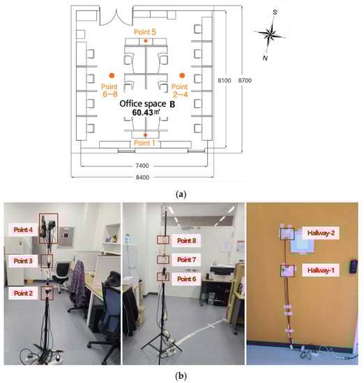 Indoor air quality measurement of a one-person office space: (a) one-person office space plane view and measurement locations, and (b) photos of the indoor air quality measurement experiment on 20 April 2021.