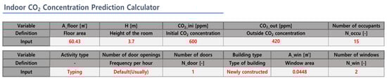 Regarding the input condition of occupant information, the user is allowed to directly input the number of occupants, which directly affects the indoor concentration of CO2. Regarding the concentration of CO2 emitted per person during activities, six types of activities were set as optional parameters in reference to the Sixth Korean Human Body Size Direct Measurement Survey Report [] of Size Korea, a domestic statistics agency specializing in the human body size; the “Met Units per Activity” [] of the ASHRAE Standard 55–2020 of ASHRAE; and the “Emissions Calculation Formula” [] of the State-of-the-Art Review of CO2 Demand Controlled Ventilation Technology and Application [].