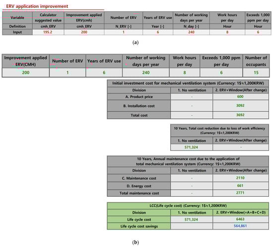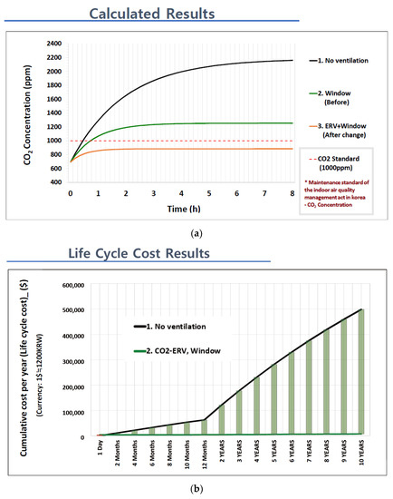 To minimize the excessive CO2 concentration during the occupancy in the office spaces, according to the process shown in Figure 13, 200 cmh was applied, which corresponds to 195.2 cmh presented in Figure 18a. The results are the same as those for 3. ERV + Window (After change) shown in Figure 19a, and the concentration was maintained at 890 ppm or less during an eight-hour occupancy. For economic feasibility analysis according to the application of the ERV, the analysis results presented in Figure 18b indicate that the final savings in the LCC due to the improvement in the concentration of occupants’ work would amount to USD 564,861 if an ERV of 200 cmh was operated for 10 years.