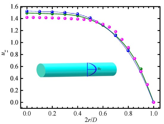 To validate the numerical model used in the present simulation, the present numerical result of the axial velocity profile along the radial direction in the pipe flow of Giesekus fluid was compared with the result given by Vachagina et al. [], as shown in Figure 2, where uz is the ratio of local velocity to average velocity and the corresponding parameters are: Wi = 4.29 and λ = 84.25 s−1. The present result of the relationship between the Nusselt number and Weissenberg number in the pipe flow of Giesekus fluid was compared with theoretical results [], as shown in Figure 3, where Br = ηua2/Dqw with η being zero-shear viscosity, ua the average velocity, D the pipe diameter, and qw the heat flux. As can be seen from Figure 2 and Figure 3, our results were in agreement with previous results.