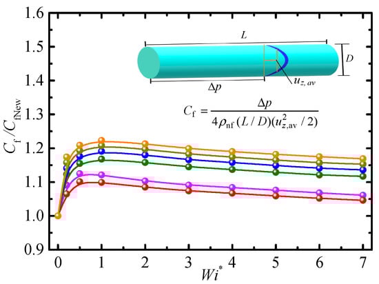 From Figure 4, we can see that Cf/CfNew is always larger than 1, i.e., the Cf of Giesekus-fluid-based nanofluids is larger than that of Newtonian fluid. Cf/CfNew = 1 when Wi* = 0 because Wi* = 2Wiτ0/(Reb0L) is the ratio of elastic force to inertial force; Wi* = 0 for Newtonian fluid. As Wi* increases, Cf/CfNew increases rapidly when 0 < Wi* < 0.5 and slowly when 0.5 < Wi* < 1, and then it decreases slowly when 1 < Wi*< 7. Wi is also the ratio of the first normal stress difference (FNSD) to shear stress. When 0 < Wi* < 1, the increase in Wi* means an increase in FNSD, so as to produce additional extension resistance and result in an increase in Cf. When 1 < Wi* < 7, the effect of the increase in FNSD is weakened; meanwhile, the effect of shear-thinning is increased, resulting in the decrease in Cf. Friction is the result of the combined action of various forces exacting on fluid. Therefore, there exists a maximum Cf for certain rheological and physical properties of nanofluids and certain flow conditions.