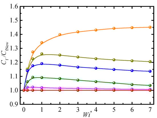 Figure 5 shows the relationship between Cf/CfNew and Wi* for different viscosity ratios, β0. β0 = 0 and 1 corresponds to pure polymer and Newtonian fluid because β0 = μs/(μs + μp). We can see that Cf/CfNew = 1 for Newtonian fluid (β0 = 1). As Wi* increases, Cf/CfNew increases rapidly when 0 < Wi* < 2 and slowly when 2 < Wi* < 7 for the pure polymer (β0 = 0), showing that Cf is directly proportional to Wi* in the absence of solvent viscosity μs. However, Cf/CfNew first increases and then gradually decreases with the increase in Wi* when 0 < β0 < 1. Therefore, the changing trend of Cf with Wi* depends on β0. In addition, Cf/CfNew increases with decreasing β0, i.e., a large β0 should be selected in order to reduce Cf.