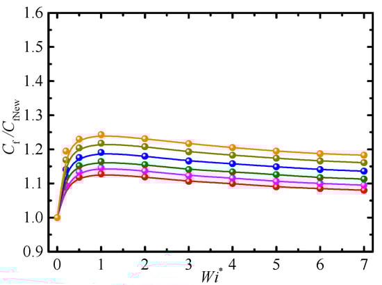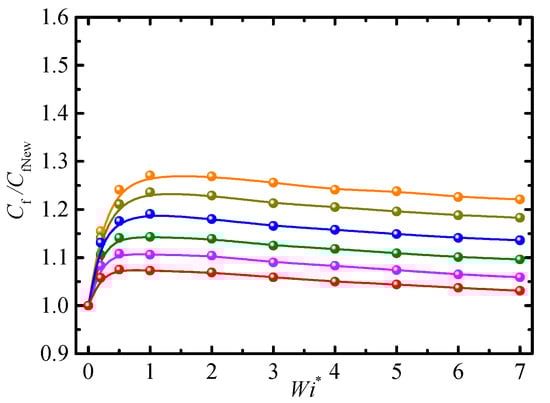 The Reynolds number represents the ratio of fluid inertia to viscosity, and its value represents the relative importance of the two. The range in Reynolds numbers in this paper was 0.5–500 because this can more fully reflect the situations of inertia or viscosity dominance. The relationship between Cf/CfNew and Wi* for different Re is shown in Figure 6, where Cf/CfNew is reduced with increasing Re, but the relationship between the reducing rate of Cf/CfNew and the increasing rate of Re is nonlinear, i.e., the change rate for Cf/CfNew is almost the same as the small change rate for Re when 0.5 < Re < 1, and there is a large change rate when 100 < Re < 500. Cf is proportional to viscosity and shear rate, and Re is the ratio of inertia to viscosity. At a small Re, the function of viscosity is large, and the shear rate is large in most regions of flow, so there is a large Cf. At a small Re, the flow is sensitive to changes in Re, so Cf is also sensitive to changes in Re. At a large Re, the inertial force is dominant against the viscous forces with increasing Re, so Cf is less sensitive to changes in Re.