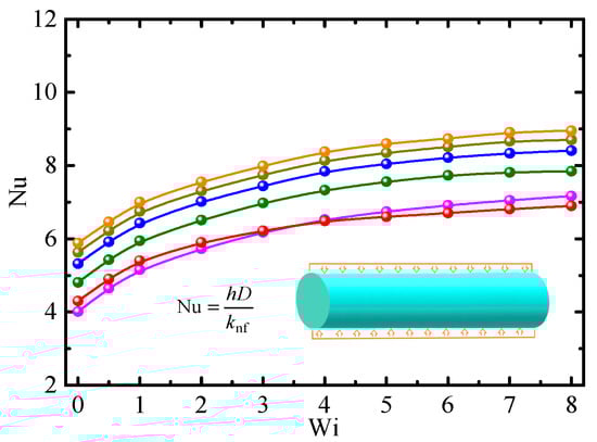 Figure 11 shows the relationship between Nu and Wi for different α. Nu increases with the increase in α, and the growth rate of Nu is almost the same when 0 < α < 0.5, showing the increase in heat transfer depends linearly on α. The larger α is, the more obvious the shear-thinning effect is and the thinner the viscous sublayer is, leading to increases in heat transfer. In Equation (5), α = 0 corresponds to Oldroyd-B fluid; therefore, the heat transfer performance of Giesekus-fluid-based nanofluids is better than that of Oldroyd-B-based nanofluids.