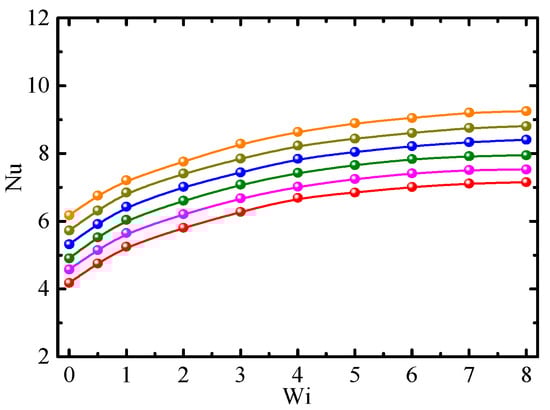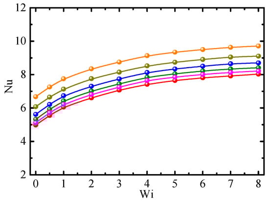 Figure 9 shows the relationship between Nu and Wi for different viscosity ratios, β0. The Nu for β0 < 1 is larger than that for β0 = 1, i.e., the heat transfer performance of Giesekus-fluid-based nanofluids was better than that of Newtonian-fluid-based nanofluids, which is in agreement with previous conclusions that viscoelastic fluid can enhance heat transfer rates compared to Newtonian fluids, e.g., []. Nu decreases with increasing β0, and the reducing rate was almost the same when 0 < β0 < 1, showing the enhancement of heat transfer depends linearly on the viscosity ratio.