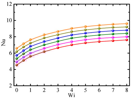 The relationship between Nu and Wi for different Re is shown in Figure 10, where Nu increases with increasing Re. The relationship between the growth rate of Nu and increasing rate of Re was nonlinear. As the flow was laminar in the range of Re in this paper, there are two reasons for why Nu was proportional to Re: (1) the laminar sublayer becomes thinner and shear stress subsequently increases with increasing Re; (2) more heat is carried by a faster moving fluid than a slower one.