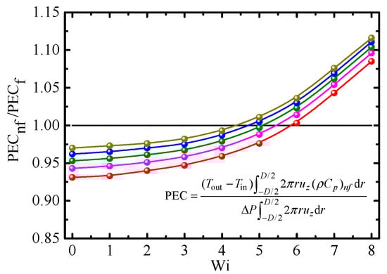 As shown above, the heat transfer performance of Giesekus-fluid-based nanofluids is better than that of Giesekus fluid, while the friction factor in the former is larger than that in the latter. Therefore, we need to balance the increase in heat transfer and enhancement of consumed power. An energy performance evaluation criterion (PEC) was employed to express the ratio of heat flow rate to required consumed power []: