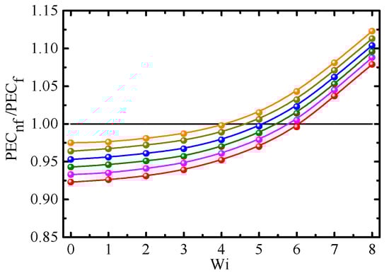 PECnf/PECf vs. Weissenberg number for different particle concentrations (β0 = 0.2, Re = 2.5, α = 0.2). ⸺●⸺: Φ = 0% (Giesekus fluid); ⸺●⸺: Φ = 0.5% (Giesekus fluid); ⸺●⸺: Φ = 1.0%; ⸺●⸺: Φ = 2.0%; and ⸺●⸺: Φ = 3.0%.