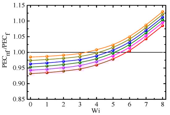PECnf/PECf vs. Weissenberg number for different Reynolds numbers (β0 = 0.2, Φ = 1.0%, α = 0.2). ⸺●⸺: Re = 0.5; ⸺●⸺: Re = 1; ⸺●⸺: Re = 2.5; ⸺●⸺: Re = 10; ⸺●⸺: Re = 100; and ⸺●⸺: Re = 500.