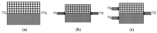Porous media in actual strata due to pore and throat distribution and connected conditions have complex, which has resulted in significant differences between interlayers [14,15]. To develop a realistic simulation of fluid flow in pores, we established double heterogeneity oil layer micro-models based on oil field development. According to the actual development of oil fields, we established the following three micro-models: full perforation and commingling production, partial perforation and commingling production-injection, and separate-layer injection and commingling production by setting different inlet positions and perforated degrees, as shown in Figure 1. The micro-models consisted of inlets, outlets, and solid walls. The upper layer represented the high-permeability layer, and the lower layer represented the low-permeability layer; each layer accounted for approximately half the width of the model. The gray zones represented porous media, and the white circles represented solid rock particles with radii of 150 μm and 75 μm, respectively, and the throat radii were 50 μm and 20 μm, respectively. The whole model was 5000 × 3550 μm2 in size. For the partial perforation and commingling production-injection micro-model and the separate-layer injection and commingling production micro-model, the length and width of inlet and outlet were 1500 μm and 500 μm, respectively. The porous media were divided into unstructured meshes.