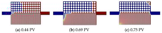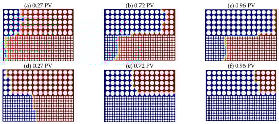 In Figure 2, Figure 2a–c and Figure 2d–f are the oil-wet and water-wet saturation distributions during the polymer flooding with different pore volume (PV), respectively.