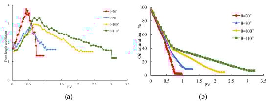Figure 3a, shows that the curve of the front length coefficient was divided into the following three stages: in the early stage of the displacement process, the interlayer breakthrough was obvious. When the rock was water-wet (oil-wet), the polymer solution preferentially displaced the low- (high-) permeability zone, and the curve showed a rising trend. When the polymer front broke through, the curve reached its highest point. As the polymer solution was injected, the water-wet (oil-wet) rock continued to displace the high (low) permeability layer, and the curve showed a declining trend; eventually, no crude oil was available, and the curve plateaued. The closer the contact angle was to 90°, the smaller the front length coefficient m would be. The primary reason was that when the wettability of rock was closer to intermediate wetting, the capillary force would be closer to 0. The interlayer breakthrough was affected by pore size, which resulted in the displacement in front of high- and low-permeability layers being uniform in propulsion.