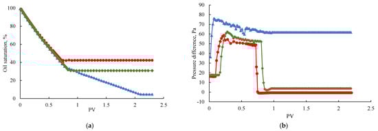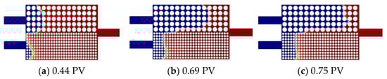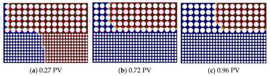 As observed from the oil saturation curves of the different wettability characteristics (Figure 3b), the oil saturation of the water-wet rocks decreased at a faster rate than that of the oil-wet rocks, primarily due to the capillary force of water-wet rocks being the driving force in the displacement process, which was conducive to polymer flooding. From 0.5 to 1 PV, the inflection points of the oil saturation appeared. This was the point of the polymer front breakthrough, where it corresponded to the maximum value of the curve in Figure 3a. Afterward, the declining rate of the oil saturation decreased as the strata formed the preferential flow pathway, which reduced the sweep rate of the unswept areas, especially under oil-wet conditions.