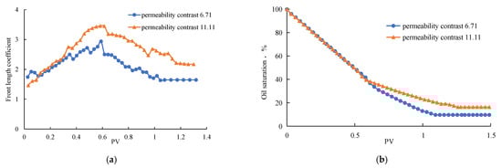The curve in Figure 8a shows that the larger the permeability contrast was, the bigger the front length coefficient would be, which was consistent with the oil saturation distribution data. After the front broke through, the polymer solution began to displace the high-permeability layer, and the front length coefficient decreased, which was consistent with Figure 2. In Figure 8b, at the early stage of displacement, the influence of the permeability differences on oil saturation was not obvious, and the oil saturation decreased at a constant rate for the two permeability contrast micro-models. After the polymer was injected at 0.52 PV, the low-permeability layer of the model with a permeability contrast of 11.11 had small pores and a high capillary force, and the displacement front broke through, the high-permeability layer was preferentially displaced, and the slope of the curve increased slightly; at that moment, the oil saturation curve of the 11.11 model was lower than that of the 6.71 model. However, when the polymer flooding continued, the subsequent polymer flooding speed was slowed due to the existence of the preferential flow pathway. When the 0.6 PV polymer was injected, the model with the permeability contrast of 6.71 had breakthroughs. Since the model had a smaller permeability contrast, interlayer interference, and flow resistance, it was more conducive to polymer flooding. Therefore, as the polymer flooding continued, the oil saturation of the curve with the permeability contrast of 6.71 decreased more rapidly than that of the 11.11 model. Finally, the displacement efficiency of the 6.71 model was 6.7% higher than that of the 11.11 model.