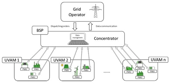 In the past, AS services were provided only by large production units such as generators, but with the integration of more intermittent generation and the development of smart grid technologies, the provision of AS is extended to smaller distributed generation and consumption units aggregated through the UVAMs. A UVAM includes five fundamental elements (see Figure 2):