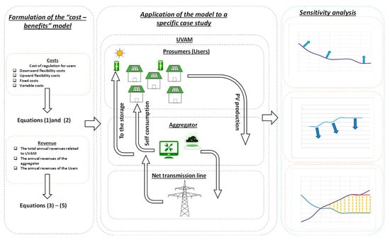 As can be easily understood, the large number of actors involved creates a dynamic and complex energy system. The responsibility to manage this system, ensuring the stability between supply and demand is maintained in every time, is entrusted to the Energy Management System (EMS). Several methods are used by EMS to prepare the optimal scheduling and to ensure the efficient operation of the units. There are methods, such as dynamic programming, that decompose the complex problem into sub-problems, each of them characterized by an optimal solution. The solution for the original problem is obtained from the intersection of the optimal solutions’ set. Always belong to the Mathematical Problem, Mixed-integer linear programming (MILP) involves problems in which only some of the variables are constrained to be integers, while other variables are allowed to be non-integers. In [13], Ahmad et al. used MILP to optimize the energy management of a microgrid (MG), reducing the peak loads of the system; while in [14], the authors used MILP to reduce the operational cost of a MG. In [15] instead, a MILP to minimize the total energy costs of all participants of the microgrid composed by PV and battery energy storage system that take part to the energy market. A quadratic programming is chosen in [16] to determine the optimal economic dispatch of a MG. Heuristic techniques are approaches used in situations where a short-term solution is required. Indeed, they study the problem starting from similar situations, and they used practical methods to produce solutions that may not be optimal, but are sufficiently reliable in determining situations. They are combined to approximate the best solution using genetic algorithms, biological evolution, and statistical mechanisms for achieving optimal operation and control of microgrid energy [17]. Both [18,19] use a genetic algorithm: the first to minimize the operating costs, the second to reduce operational and life cycle costs, and dump energy. In [20,21], the authors used fuzzy logic control to minimize both the costs of the generating units and the emission levels of the fossil fuel sources of a microgrid. Metaheuristics are methods to solve complex problems characterized by a higher-level strategy based on a heuristic method. The metaheuristics can be distinguished into metaheuristics with single solution, in which a succession of solutions is calculated, and the solution is updated only if the new one satisfies a predefined criterion, and metaheuristics based on population, where many entities are simultaneously sent in parallel to solve the same problem [22]. Swarm algorithm is used by [23] to minimize both the capital and fuel costs of a MG, by Hossain et al., whose model for charging and discharging a battery allows them to reduce the operation cost of a MG in significant way. A multi-objective, intelligent energy management system for a MG that minimizes the operational costs and environmental impact by an artificial neural network, as soon as [24], who use neural networks to predict wind turbine generation. Multi-agents used on microgrids allow a decentralized management of the microgrid and consist of sections having autonomous behavior to execute the tasks with defined objectives. Stochastic methods and robust programming are used to solve the optimization functions when the parameters have random variables, particularly in artificial neural networks, fuzzy logic, and game theory [25]. Predictive control techniques are used in applications where the accurate forecasting of loads (or generation) is requested to guarantee effective management of the grid (i.e., all the grids in which the percentage of renewable energy sources is relevant). This typically combines stochastic programming and control [26]. Different from other papers in the literature [27,28,29,30], this work aims to evaluate the profitability for users and aggregator involved in the UVAM providing an innovative methodology, that is articulated in two steps: (1) a cost–Benefit Analysis (CBA), which aims to identify the main costs/benefits parameters’ impact on the revenues of the UVAM, (2) a Sensitive Analysis (SA), which aims to provide a strategic decision making tool. In fact, one of the key problems with CBA is that it cannot stand alone in the decision-making process.