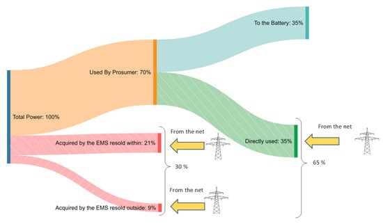 As mentioned, “downward flexibility” takes the form of a reduction in the input of energy into the grid or a greater absorption by the aggregate energy system. To contribute to the downward flexibility, a first action that can be put into practice is the detachment of PV systems, as above supposed [40]. Considering the reduction in injection into the grid, this will mean that prosumers will be forced to purchase energy that they previously drew from the PV system, and therefore the aggregate system will absorb additional power from the grid. Similarly, EMS will not purchase the necessary power from prosumers, but will have to purchase it from the network to resell it within the aggregate energy system. What has been said will be better clarified in the case study.