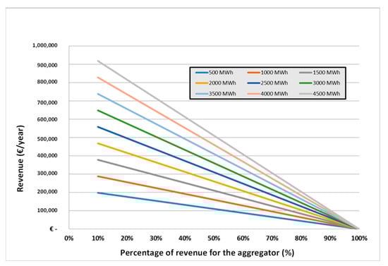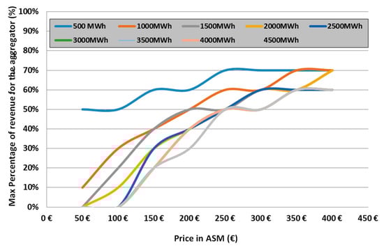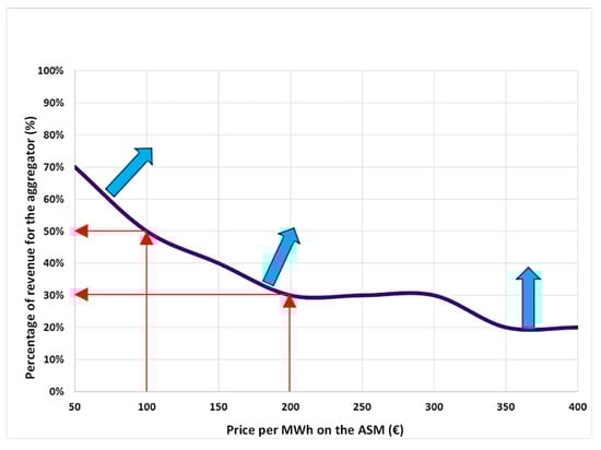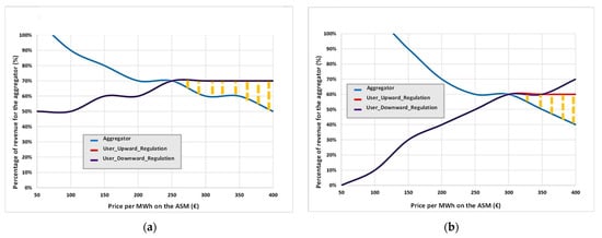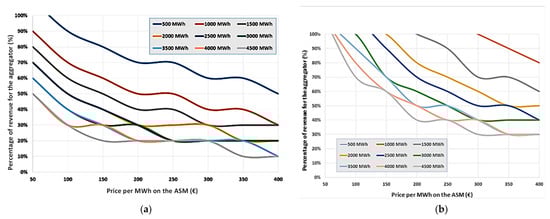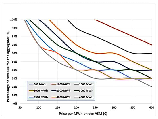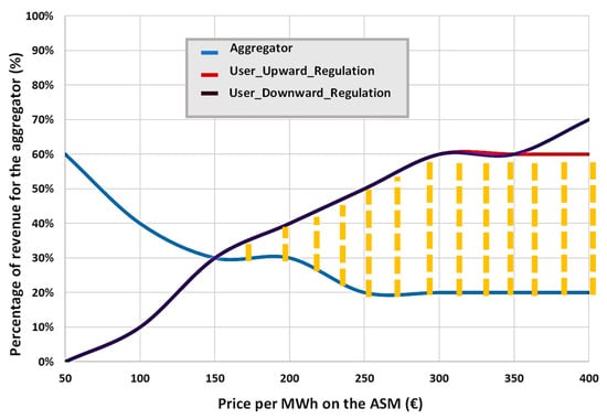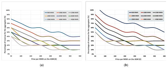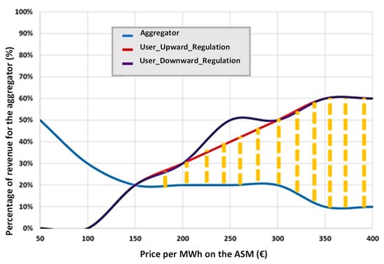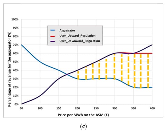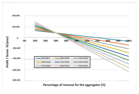From the application of the model (Equations (1)–(5)), through a sensitivity analysis, on the amount of energy exchanged and on the sale energy price, diagrams were obtained that showed the curves trend underneath the profit areas of the aggregator and of the users. From the intersection of the results, the shared areas of convenience were observed. These areas show the set of operating points of the UVAM, in which a profit margin is shown for both the aggregator and the users. It is worth noting that a SA generally investigates how the variation in the output of a numerical model can be attributed to variations of its input factors. It is generally used with the goal to verify the consistency of the model behavior [40]. In this study, on the other hand, the SA identifies the profit areas that have been recognized separately for aggregator and users, itself constituting a part of the cost–benefit model.