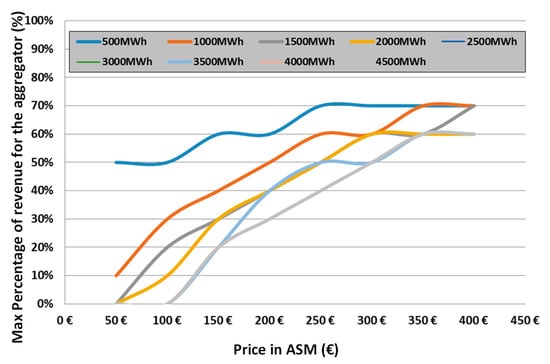 represents the percentage of revenues, related to the aggregator (%), which has been varied from 10% to 100%.