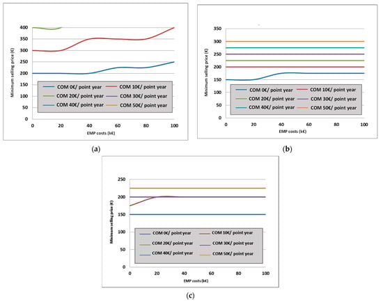 The sensitivity analysis proposed shows the variation of the minimum price relating to the MWh offered on the MSD, in order to show the economic convenience for UVAM actors involved. Figure 18a–c show the trend of this parameter in correspondence with three values of energy exchanged annually referred to low, medium, and high exchange regimes (500 MWh–2000 MWh and 4500 MWh) as a function of the EMP cost and parameterized according to the COM cost. The influence of the cost of the management platform becomes weighty exclusively for low volumes of energy exchanged with the TSO, while for medium–high volumes, the minimum price is primarily influenced by the value of the cost of the communication; this confirms the importance of this parameter in the general economy of UVAM. In fact, the lower the cost of communication, the lower the value of the minimum sale price; while the greater the volume of energy exchanged with the network, the lower the value of the minimum price, all other factors being equal. In the cases analyzed, the lack of common economic convenience for MWh sales prices lower than €150 is evident.
