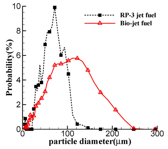 The key physical properties for jet fuels are measured at 20 °C. Table 1 compares the properties of the bio-jet fuel with those of RP-3 jet fuel. It shows that the properties of the bio-jet fuel meet the standards of RP-3 jet fuel. Notice that the viscosity of the bio-jet fuel is almost twice the standard limit of RP-3 jet fuel. The viscosity has great influence on the fuel atomization performance. In our previous experiment, the particle Sauter mean diameters of the two fuels, atomized by a centrifugal nozzle at different atomization pressures, were measured, and the probability density distribution of the particle diameters at atomization pressure of 4 bar are shown in Figure 2 [28]. The figure shows that the bio-jet fuel forms much larger particles than the RP-3 jet fuel.