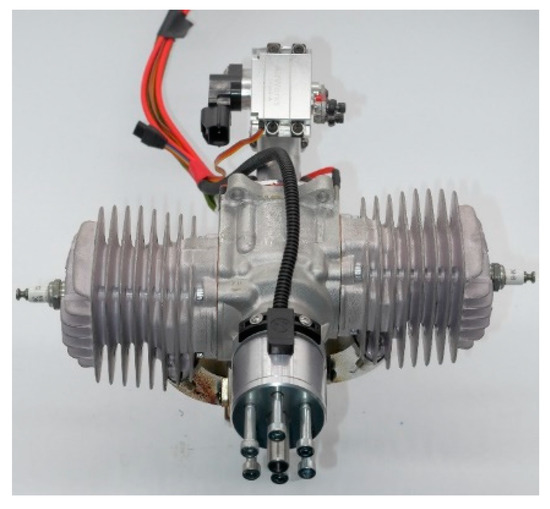 The small, two-stroke, SI aviation piston engine is shown in Figure 3. The engine has two horizontally opposed cylinders and uses a leaf valve to control inflow air. The engine is able to be fueled by a variety of fuels by adopting the port fuel injection strategy and crankcase preheating technology. Listed in Table 2 are the main performance parameters of the engine.