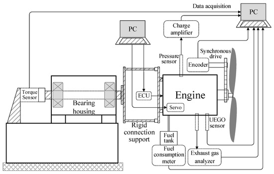 The tests were carried out on our homemade PTT30 propeller test bench, as shown in Figure 4. The test bench is mainly composed of a bearing housing and a rigid connecting support, attached with the bearing shaft. The engine is fixed on the rigid connecting support and the propeller is installed on the engine output shaft. When the engine drives the propeller, the torque is transferred via the rigid support to a torque sensor that is installed on the bearing shaft. An encoder used to measure the crankshaft position was attached on the engine output shaft through a synchronous drive belt. A Kistler 6052C pressure sensor was plugged into the cylinder to measure the cylinder pressure, and a Kistler SPC 2852A signal conditioning system was used to amplify the cylinder pressure signal. An NHA-506 exhaust gas analyzer was used to measure and analyze the compositions of exhaust gas. A UEGO sensor was plugged into the exhaust manifold to monitor the excess air coefficient. A fuel consumption meter was connected with the fuel tank to measure the fuel consumption. When the engine worked, an ECU was used to adjust the fuel injection to control the excess air coefficient, a servo was installed on the intake valve of the engine to adjust the throttle opening, and a capacitor discharge ignition system was used to ignite the engine.