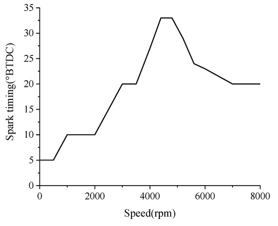 All tests were carried out at normal temperature and pressure. The temperature, pressure, and humidity of the environment were 7 °C~10 °C, 102 kPa~103 kPa, and 56~65%, respectively. The excess air coefficient of the fuel–air mixture was controlled at around 1.0. The throttle openings were from 30% to 75%, which corresponds to speeds from 4500 rpm to 6500 rpm. The load of the engine was to drive the propeller, so the engine speed increases as the throttle opening increases, and the spark timing was adjusted correspondingly to maintain stable operation of the engine. The relationship between the spark timing and the engine speed was pre-set, as shown in Figure 5. BTDC in the figure means before top dead center.