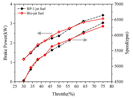The brake powers and speeds of the engine fueled with the RP-3 jet fuel and the bio-jet fuel at different throttle openings are presented in Figure 6. The figure shows that the brake power and speed increase as the throttle opening increases. At small throttle openings, the brake power and speed of the bio-jet fuel were very close to those of RP-3 jet fuel, and became slightly higher than those of RP-3 jet fuel at medium throttle openings. As the throttle opening increased to over 60%, the brake power and speed of the bio-jet fuel became smaller than those of RP-3 jet fuel. At 75% throttle opening, the brake power and speed of the bio-jet fuel were smaller than those of RP-3 jet fuel by about 5% and 1.7%, respectively.
