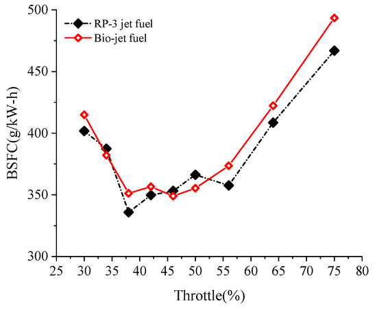Figure 7 shows the variation of the brake specific fuel consumption (BSFC) of the engine against the throttle opening. The curves show that the BSFC first decreased and then increased, and it reached a low plateau from throttle opening of about 35% to 60%. The load of the engine is to drive the propellor, so the speed increased as the throttle opening increased. Large throttle opening leads to small pumping loss, while at the same time, large speed leads to large friction loss and large scavenging loss, caused by the short-circuiting of the scavenge duct and the exhaust duct. Under the combined effects of these factors, the BSFC presented a trend of decreasing first and then increasing as the throttle opening increased. The throttle opening of 35–60% corresponds to the most economic working condition of the engine. The range of the economic condition of the engine remained consistent when the fuel was changed from RP-3 jet fuel to the bio-jet fuel, and the BSFC of the bio-jet fuel was comparable to that of RP-3 jet fuel under the economic condition. When the throttle opening increased to over 55%, the BSFC of the bio-jet fuel became higher than RP-3 jet fuel, and it was about 10% higher than RP-3 jet fuel at 75% throttle opening.