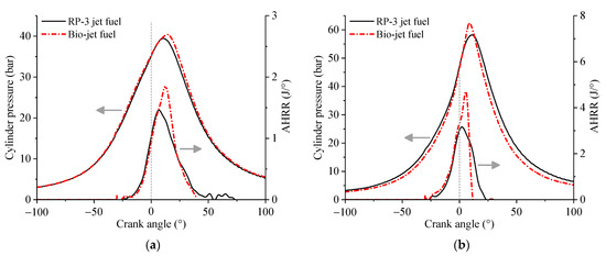 Figure 6 and Figure 7 show that there were some differences between the brake power and BSFC of the engine fueled with the bio-jet fuel and RP-3 jet fuel at medium and large throttle openings. The cylinder pressure and the apparent heat release rate (AHRR) at throttle openings of 46% and 64% are plotted in Figure 8 to figure out the reasons for these differences. The crank angle of 0° in the figures is the top dead center (TDC). The cylinder pressure drawn in Figure 8 is an average of 200 cycles of cylinder pressures. The AHRR is the heat released at each crank angle and is calculated using the cylinder pressure data according to the following equation, via the software GT-Power: