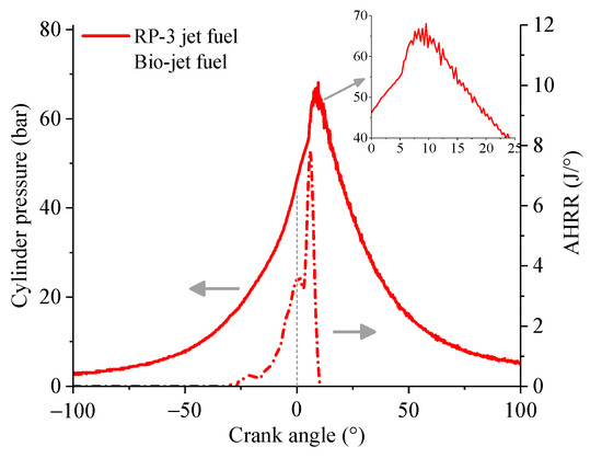 Statistic calculations were made to find the reason for the difference between the cylinder pressure and AHRR of the two fuels. According to the calculation results, the probability of knock combustion occurrence of the engine fueled with the bio-jet fuel was about 72% at the 64% throttle opening, while the corresponding probability of RP-3 jet fuel was only about 4%. Figure 9 shows the cylinder pressure and the corresponding AHRR of the bio-jet fuel of one cycle at the 64% throttle opening. It can be seen in the figure that the cylinder pressure presented high-frequency vibrations near the peak point, and the AHRR curve also shows a significant spike at the corresponding time, which suggests that knock combustion occurred. It can be noticed that the vibration amplitude of the cylinder pressure was not large, which means the knock combustion was not intense enough to damage the engine. In the experiment, it was found that, once the throttle opening increased to over 75%, the knock intensity would increase significantly, which would make the cylinder temperature rise sharply, and the engine would be damaged.