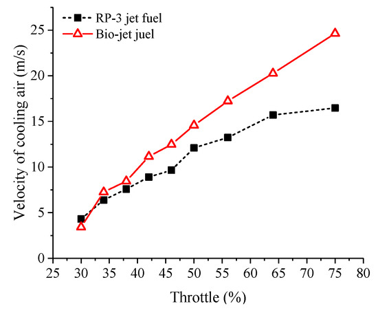 Knock combustion is a strong, spontaneous combustion. It indicates that the difference between RP-3 jet fuel and the bio-jet fuel should be attributed to the fact that the bio-jet fuel has a higher tendency to spontaneously combust. The velocity variation of the cylinder cooling air could also prove the occurrence of spontaneous combustion. Figure 10 shows the cooling air velocity. At conditions of throttle opening less than 40%, the velocity of cooling air of the bio-jet fuel was close to that of RP-3 jet fuel. At throttle openings over 40%, the cooling air velocity of the bio-jet fuel became larger than the RP-3 jet fuel, and the difference between them rose with the increased throttle opening. This was because, as the throttle opening increased and the cylinder pressure and cylinder temperature increased, so did the possibility of spontaneous combustion. When the throttle opening increased to over 40%, spontaneous combustion of the mixture of bio-jet fuel and air occurred, so the cylinder temperature rose, and the cooling air flux was turned up to prevent the cylinder from being damaged. As the throttle opening continued to increase, the intensity of spontaneous combustion increased, and knock combustion was triggered, which made the cylinder temperature rise sharply and therefore the cooling air velocity increased rapidly.