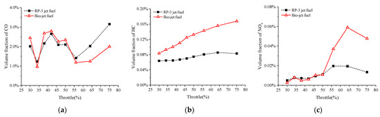 Figure 11 compares the volume fractions of NOx and unburned intermediate reactive products CO and HC in the exhaust gas. It shows that the engine exhaust emitted more HC when burning the bio-jet fuel than when burning RP-3 jet fuel under all test conditions, and the difference between them increased from about 30% to 100% as the throttle opening rose from 30% to 75%. For throttle openings smaller than 50%, the volume fractions of NOx and CO of the bio-jet fuel were close to those of RP-3 jet fuel, while for throttle openings larger than 50%, the volume fractions of NOx and CO of the bio-jet fuel became larger and smaller, respectively, than those of RP-3 jet fuel. At 75% throttle opening, the NOx volume fraction of the bio-jet fuel was almost 3.53 times larger than that of RP-3 jet fuel, and the CO volume fraction of the bio-jet fuel was about 63% of that of the RP-3 jet fuel.