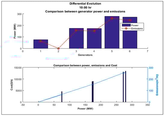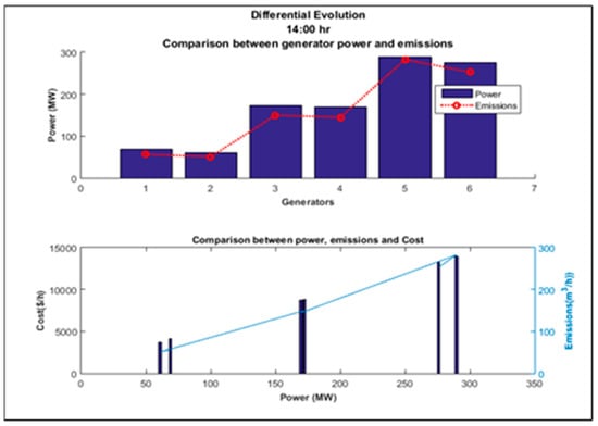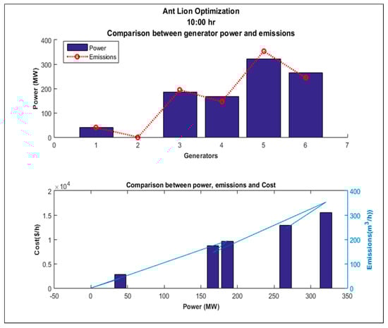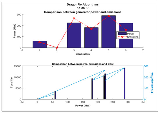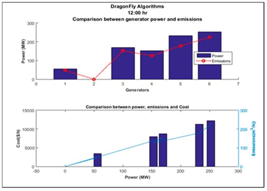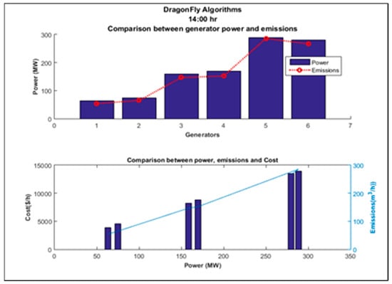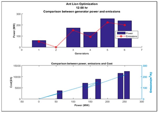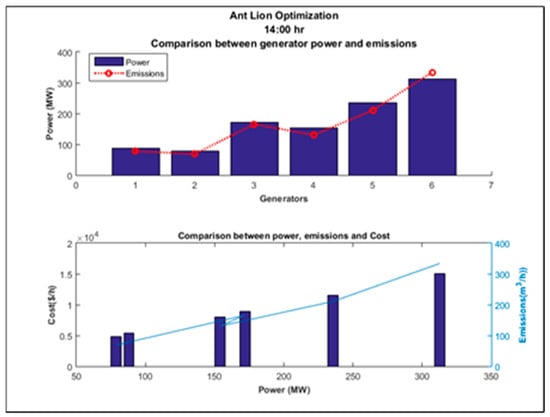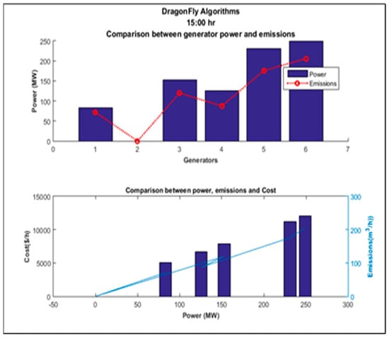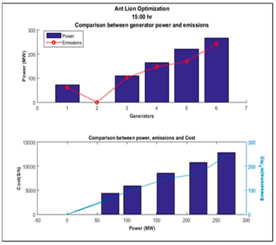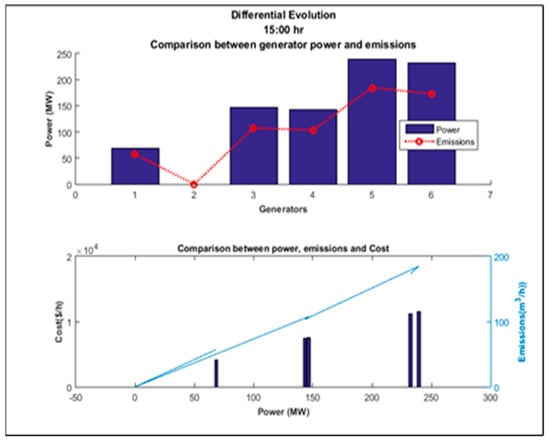 Figure 22, Figure 23, Figure 24 and Figure 25 show the results of the data obtained in Table 5, which represent the values of power, emissions and fuel costs generated by the techniques (ALO, DA and DE) at 15:00 p.m. demand.