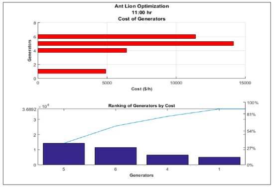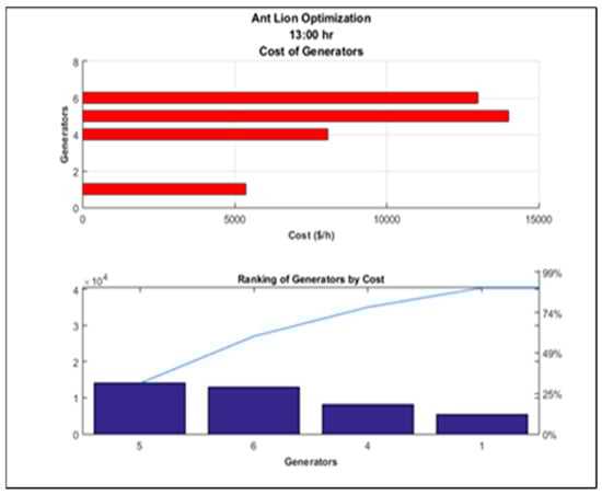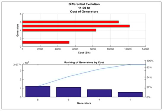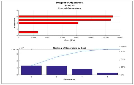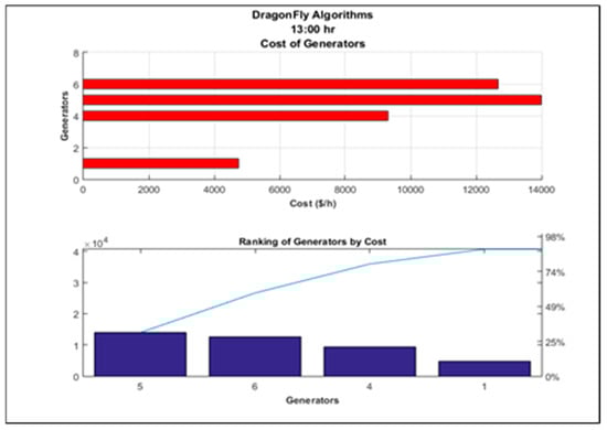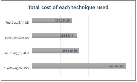 Table 11 presents the simulated metaheuristic techniques from 10:00 a.m. to 15:00 p.m. and the results achieved by each technique. We observed that the DE technique achieved the best fuel cost reduction five times in the six simulations, DA obtained the second-best result, ALO was in third place, and obtained better results only on PSO.