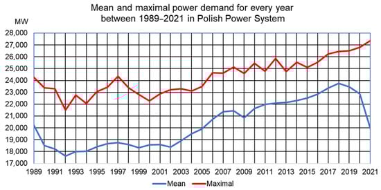 Mean and maximal power demands in MW, for every year between 1989 and 2021 in Polish Power System [].