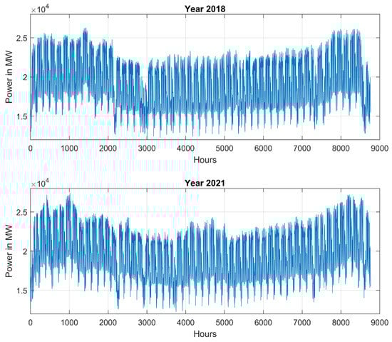 The database of the Polish Power System of the last few years [] will be used in all numerical experiments (The database of the Polish Power System within different years is available from https://www.pse.pl/obszary-dzialalnosci/krajowy-system-elektroenergetyczny/zapotrzebowanie-kse, (accessed on 1 January 2022)). The total demand for power in the system has changed over the years. The yearly average and maximum values in the form of mean and maximal power demand are presented in Figure 1 for the period 1989–2021. Large differences between these two load patterns are visible. For example, in the year 1992, the mean was 17,730 MW with a maximum of 21,508 MW, while in 2013 the mean was 22,150 MW and the maximal demand 24,848 MW.