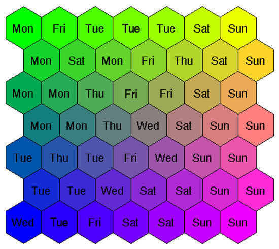 Figure 3 depicts a graphical form of the statistical distribution of the power demand depending on the type of the day in the form of a so-called Kohonen map of 49 prototype vectors representing the averaged day load patterns on the weekdays. The 24-h power demand vectors have been grouped in clusters of similar load patterns. The 24-h load patterns corresponding to Saturdays and Sundays create clusters on the right side of the image. The other (working) days from Monday to Friday are grouped on the left and are not interlaced with the weekend days.