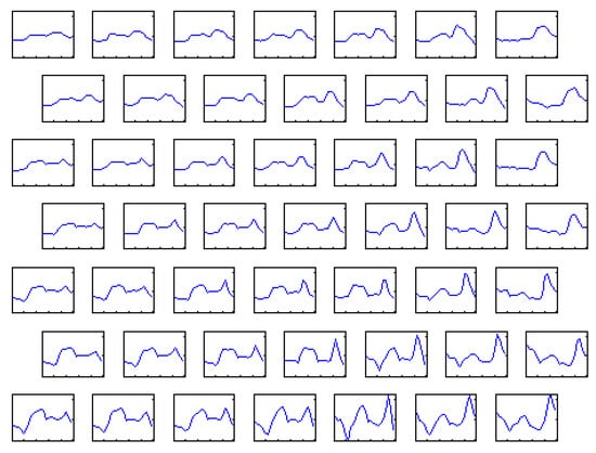 where Pm(j) represents the mean value vector of real power consumption in jth day and its standard deviation. Both parameters are estimated based on data corresponding to the previous years existing in the database. The self-organization procedure using the Kohonen algorithm applied to the set of normalized learning data (profile vectors) leads to the creation of cluster centers representing the set of patterns of 24-h daily load. Figure 4 presents some exemplary distribution maps of 49 center vectors created in the learning process of the Kohonen network. The curve inside of the box depicts the shape of the 24-h load pattern of this particular center.